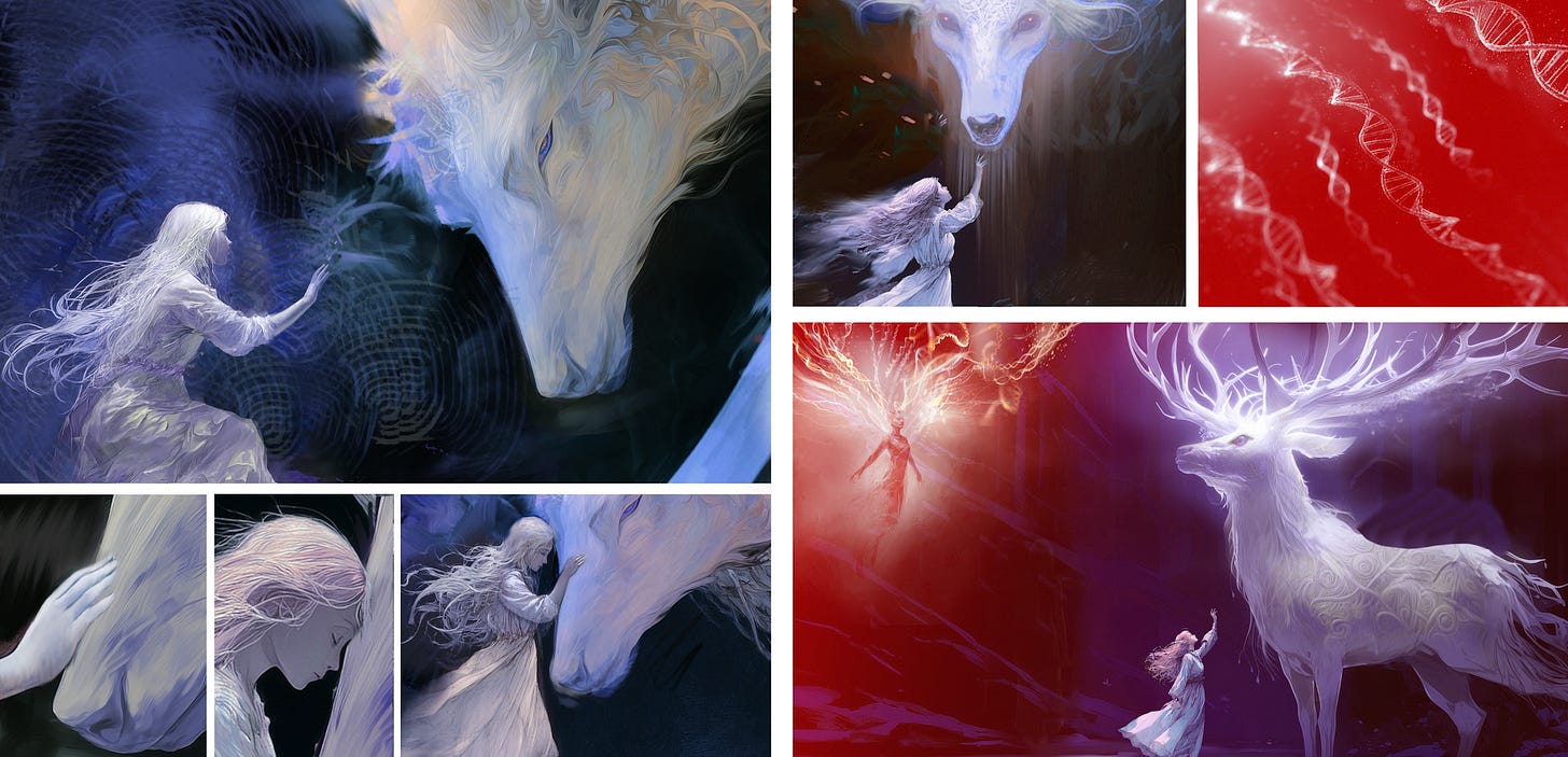 White Deer: Rites of Passage began as a mythic poem that was downloaded from the æthers. At its center was a twelve-year-old girl aware of life changes coming her way, yet not ready to accept them. The poem unfolded as a rite of passage. I felt the emotion of transformation within these words. In this story, growing up became a fairy tale, rich with symbolic hallucinations. From poem, to graphic novel, to animated film; I was feeling my way through, confronting my fears, and allowing spirit to push me beyond my limitations.