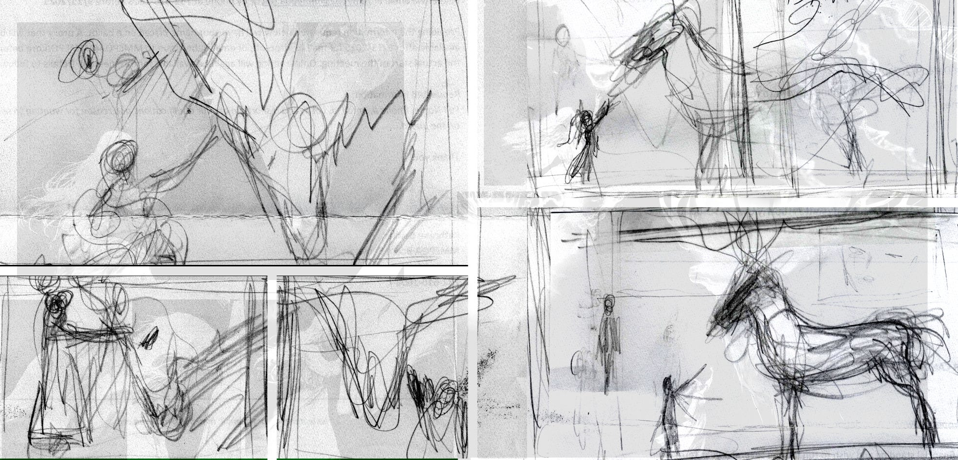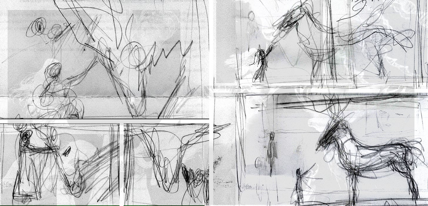 To translate the poem into visual form, I created rough storyboards for a graphic novel. Page after page told the fantastical story of the girl’s resistance to adolescence, using sequential imagery. My background in film as a concept designer shaped this process: events formed scenes, scenes accumulated into chapters, chapters became acts. Panels and pages were equivalent to cuts in the editing room.
